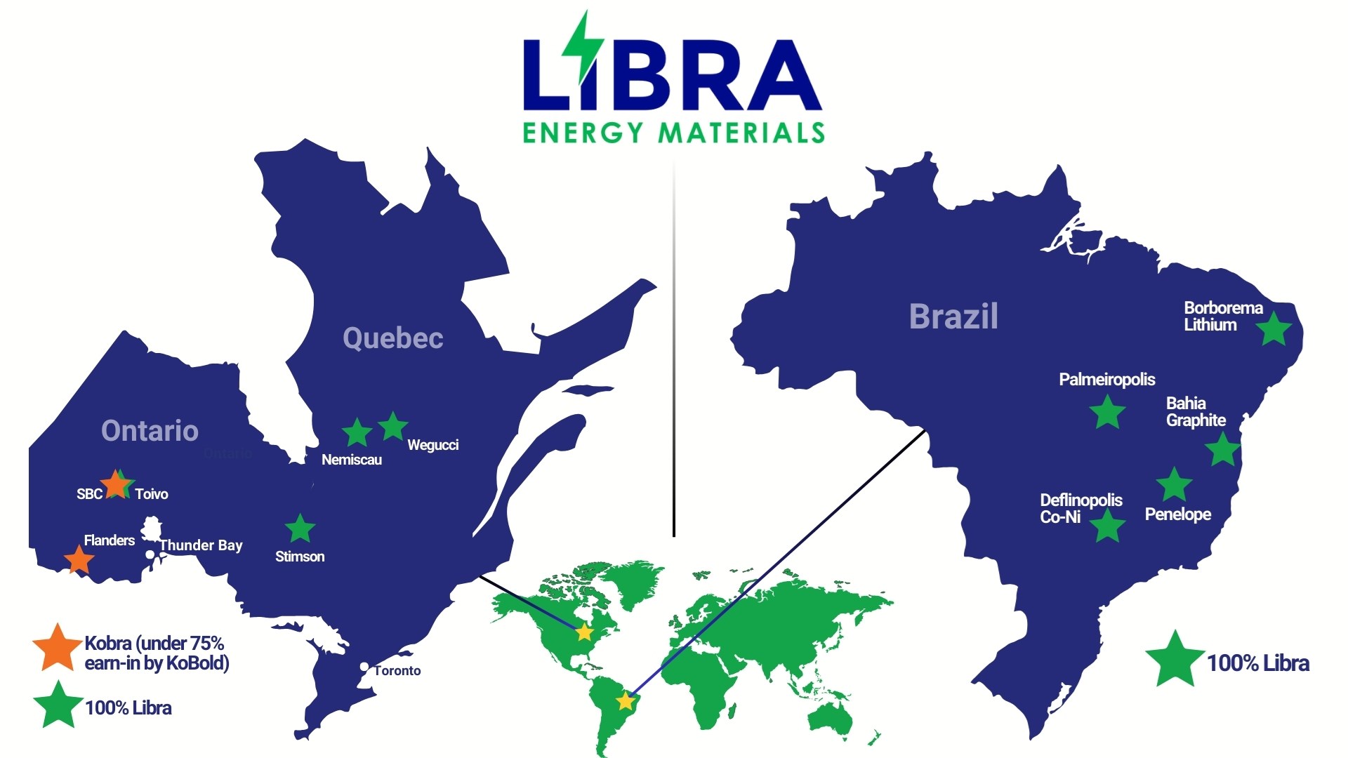 Figure 1: Maps showing Libra's portfolio across Canada (left) and Brazil (right), including the Kobra projects. Not to scale.