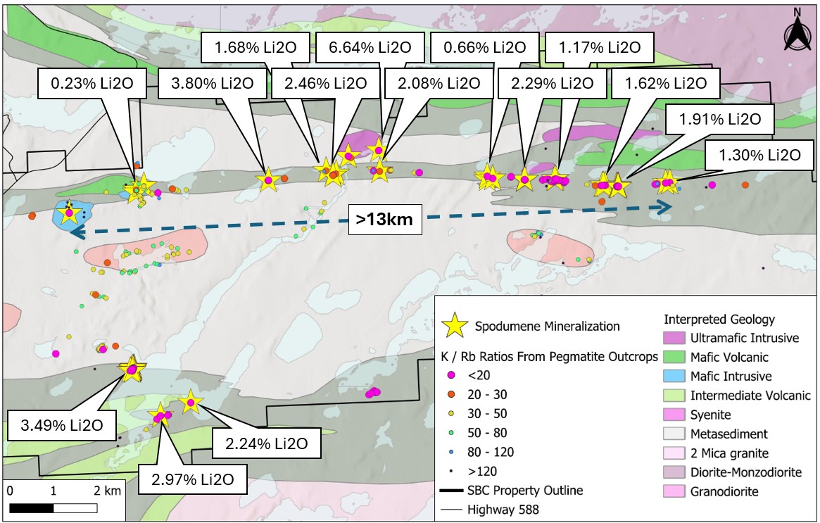 - 2.08% Li2O surface sample at SBC (spodumene-bearing)