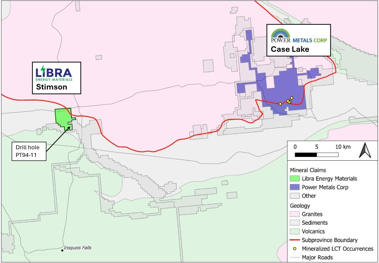 Stimson is strategically located along strike of Power Metals' Case Lake lithium-cesium deposit, straddling the same boundary between the Quetico and Abitibi subprovinces. Importantly, a historical drill log at Stimson noted three intervals, the largest being 39.8 metres ("m") (60.0 m – 99.8 m) logged as a 'granitic complex', an unknown portion of which was pegmatite containing possible spodumene in DDH PT94-11 (OGS Assessment Record 42H02SE0010). This historical result provides evidence of a potential lithium-bearing pegmatite system on the Project that Libra plans to test through its initial drilling campaign. Although Libra is primarily targeting spodumene, the key lithium-bearing mineral found in lithium-cesium-tantalum ("LCT") pegmatites, the Company will also evaluate the potential for pollucite, which is the main cesium-bearing mineral in LCT pegmatites. The Company notes that while mineralization on nearby or adjacent projects is not necessarily indicative of mineralization at Stimson, the Quetico-Abitibi subprovince boundary is proven to be fertile for hosting both pollucite and spodumene.