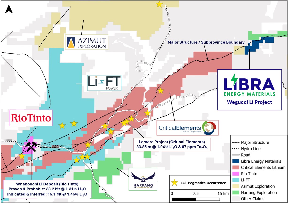 What area and nearby deposits relate to Libra's Wegucci and Nemiscau projects (LIBRF)?