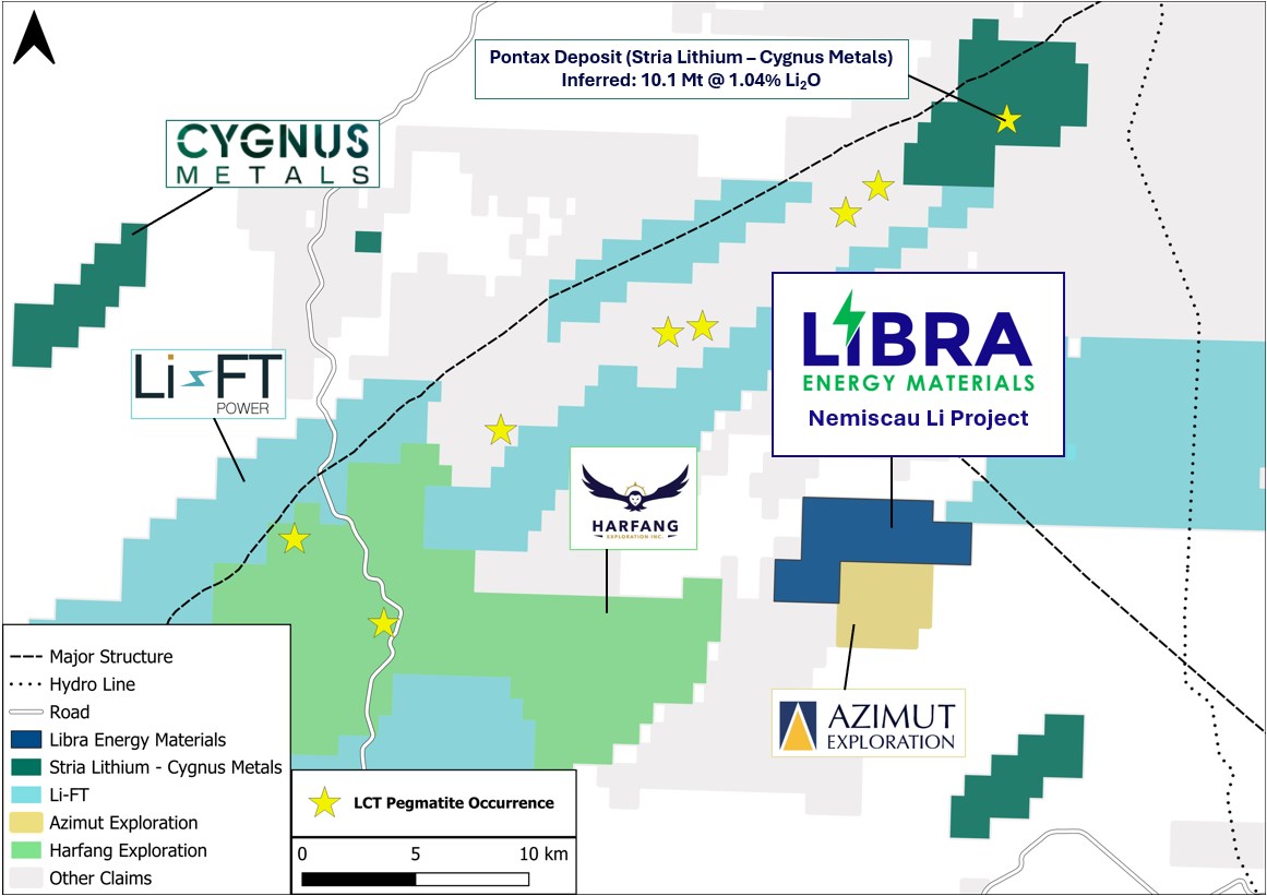 The Nemiscau property lies within the Eastmain Subprovince near James Bay in northern Québec, approximately 18 kilometres (km) south of Cygnus Metals' Pontax lithium deposit (Figure 3). The 2,454-hectare Nemiscau property has historically been mapped as hosting a rose-coloured pegmatitic granite. Most of the ground remains underexplored, with only the southeastern and southwestern corners visited during Libra's initial field program.